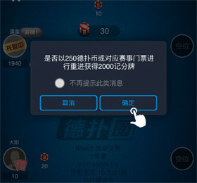 · 当玩家在赛事中筹码被清零时,在赛事中会弹出提示框。若玩家勾选不再提示此类消息,点击确定按钮后,将认定玩家选择自动重进。