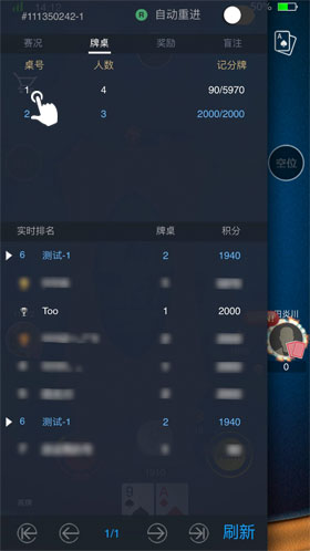 在锦标赛中,玩家看到的有关赛事的数据非实时刷新,包括各个玩家筹码量、平均记分牌、赛事剩余人数等,若玩家想要获知最新的数据,需要点击刷新按钮或者向下滑动屏幕以触发刷新,获知最新的赛事详情。